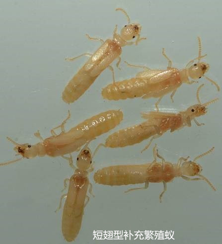 補(bǔ)充繁殖蟻有兩類(lèi):短翅型(或稱(chēng)成蟲(chóng)第二型)和無(wú)翅型(或稱(chēng)成蟲(chóng)第三型)。此種現(xiàn)象在較高級(jí)的白蟻科昆蟲(chóng)的巢中比較少見(jiàn)。